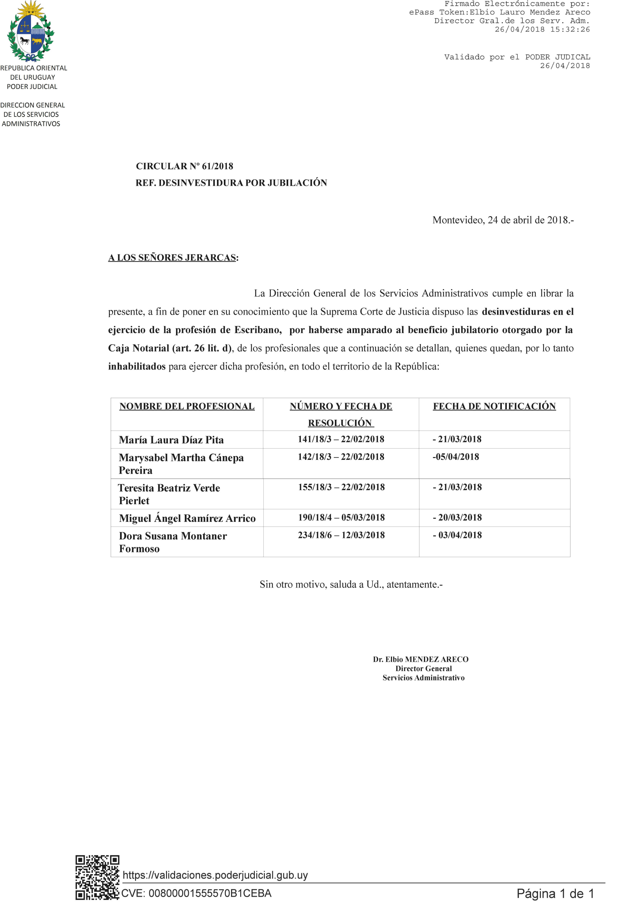 061/2018 - Desinvestidura de Escribanos por jubilación
