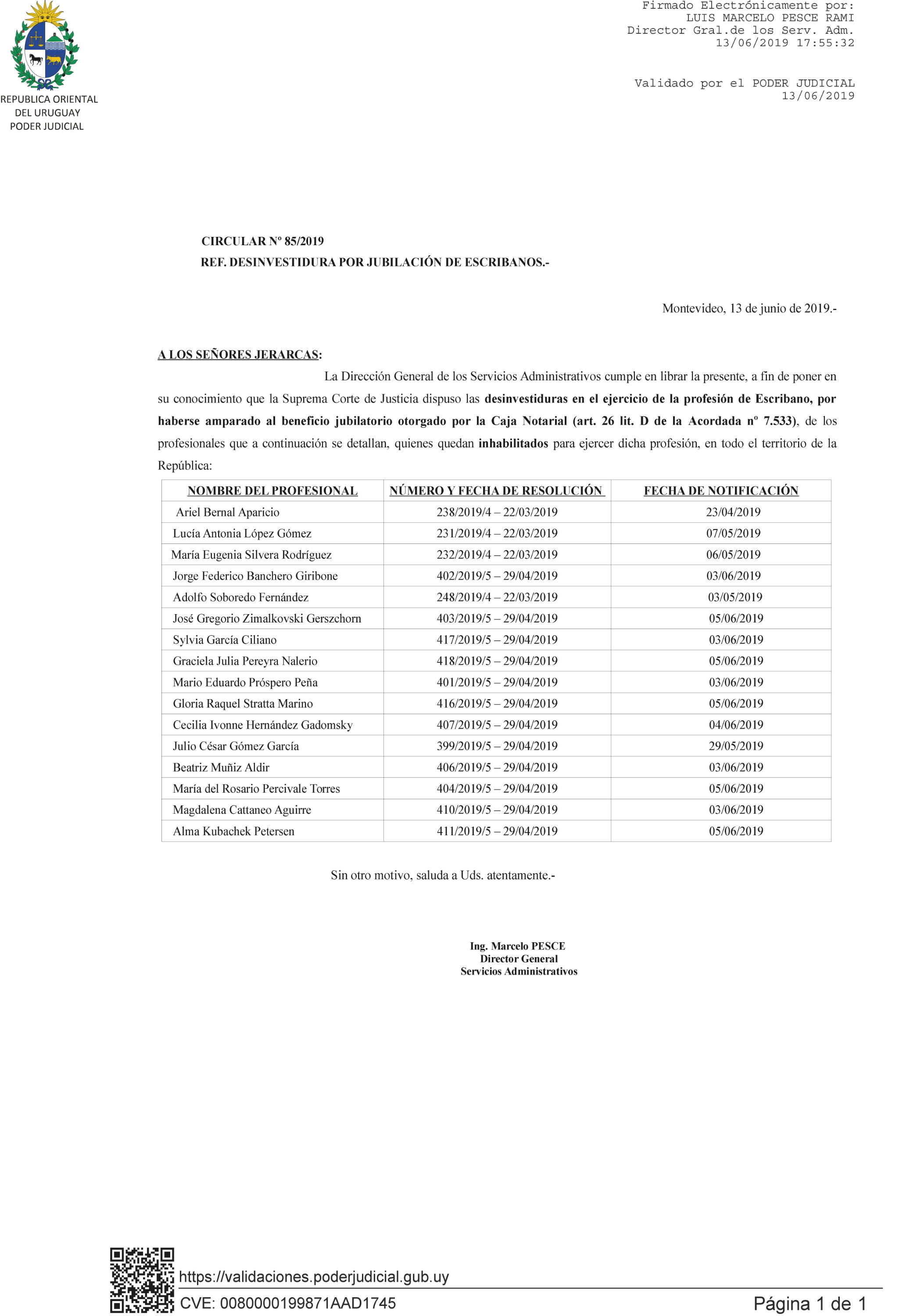 085/2019 - Desinvestidura de Escribanos por jubilación