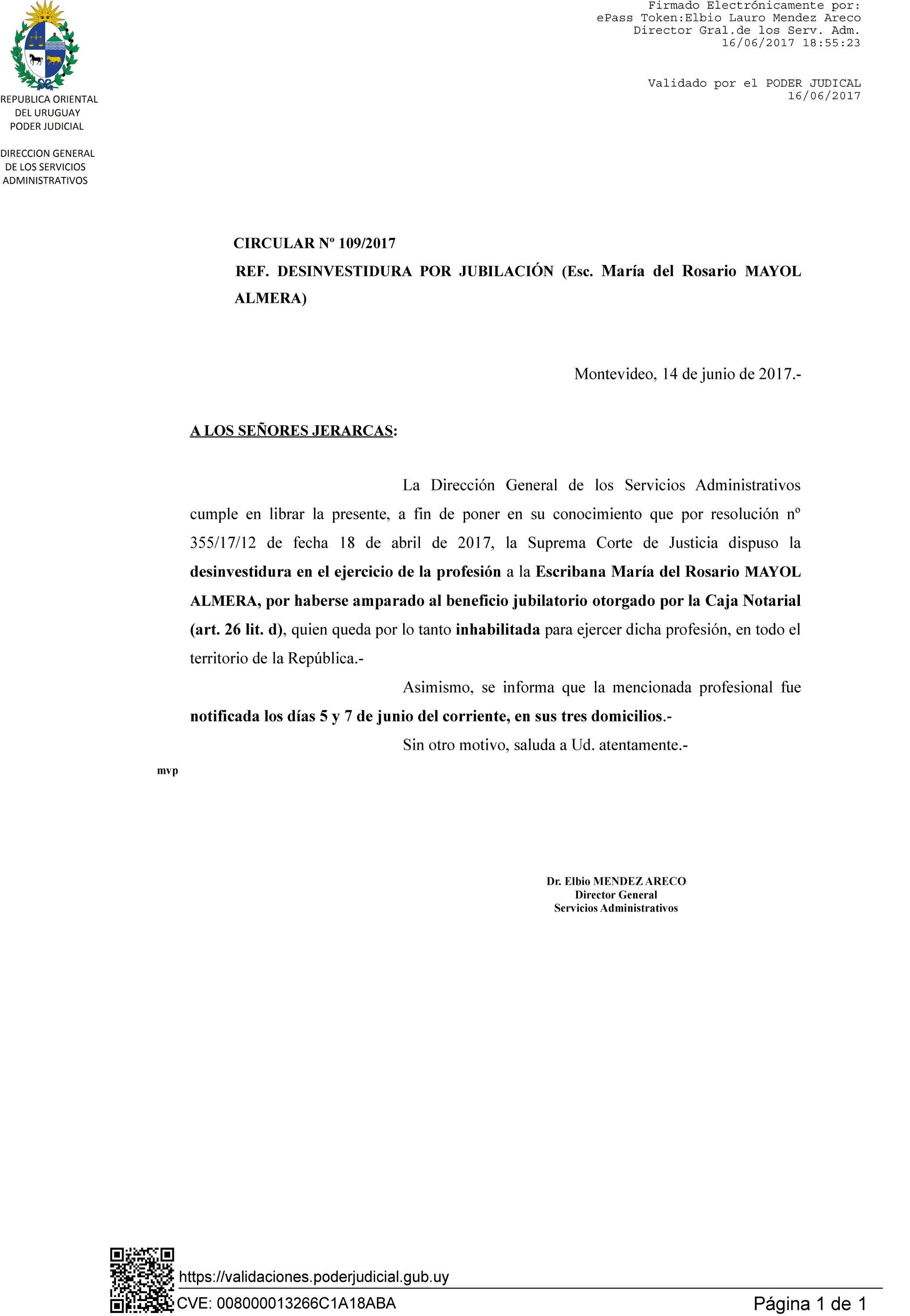 109/2017 - Desinvestudura de Escribana por jubilación