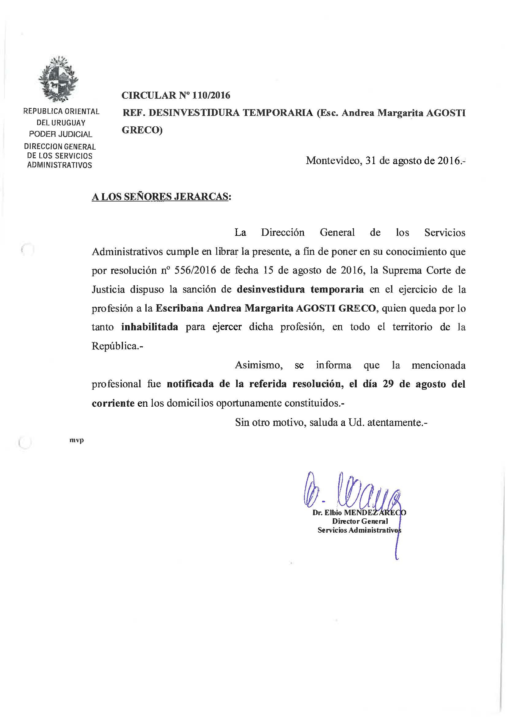 110/2016 - Desinvestidura temporaria de Escribana
