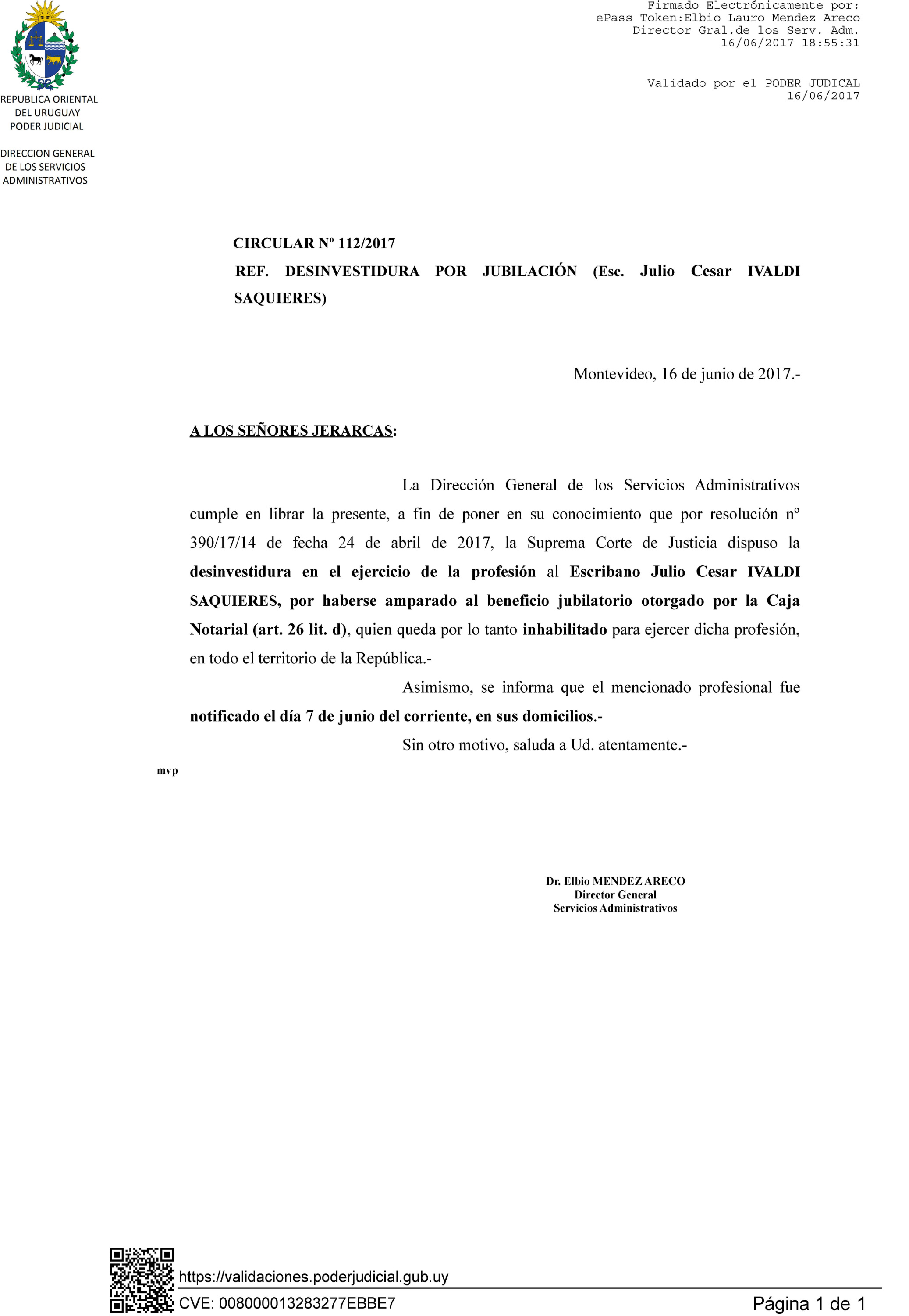 112/2017 - Desinvestidura de Escribano por jubilación