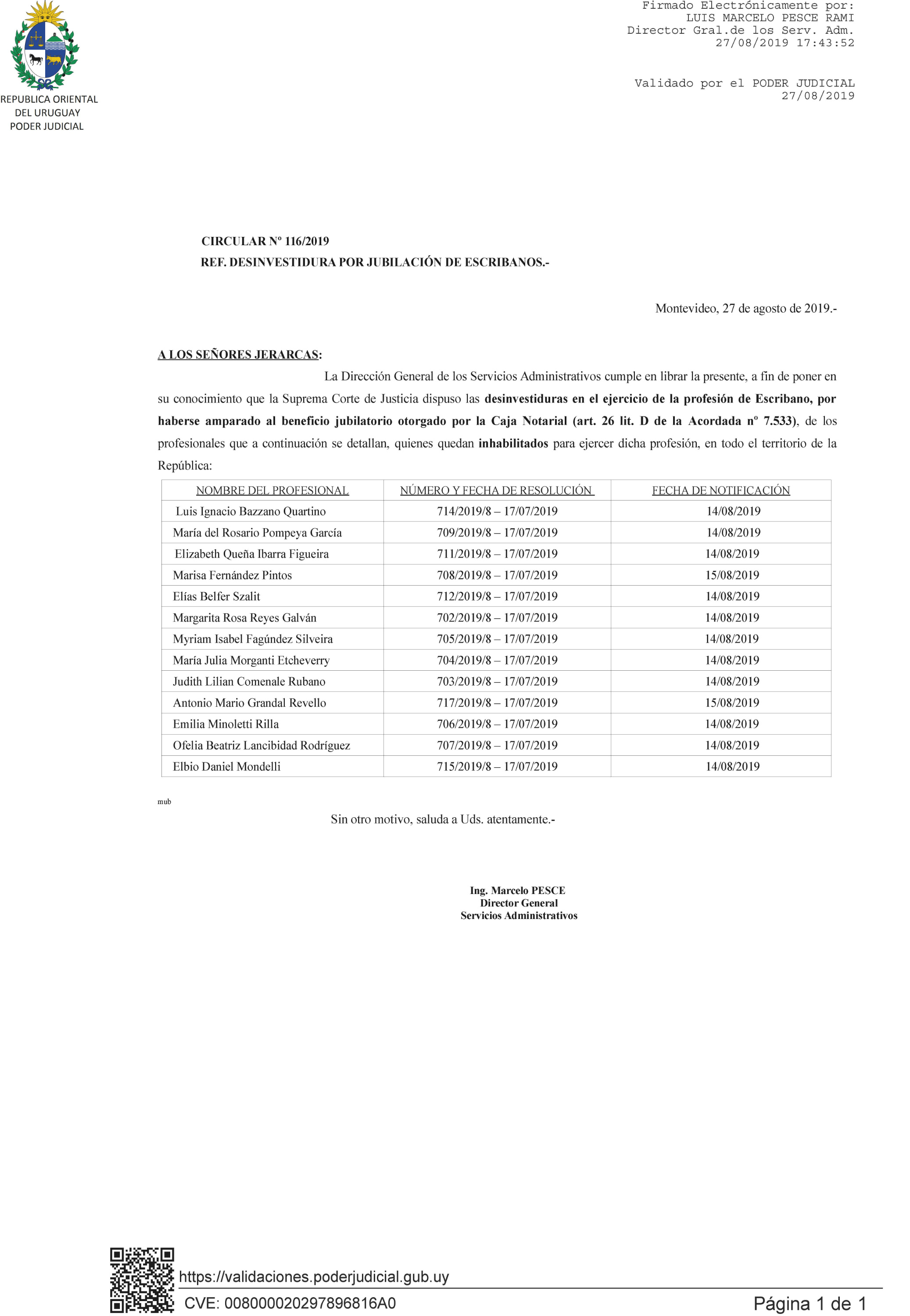 116/2019 - Desinvestidura de Escribanos por jubilación