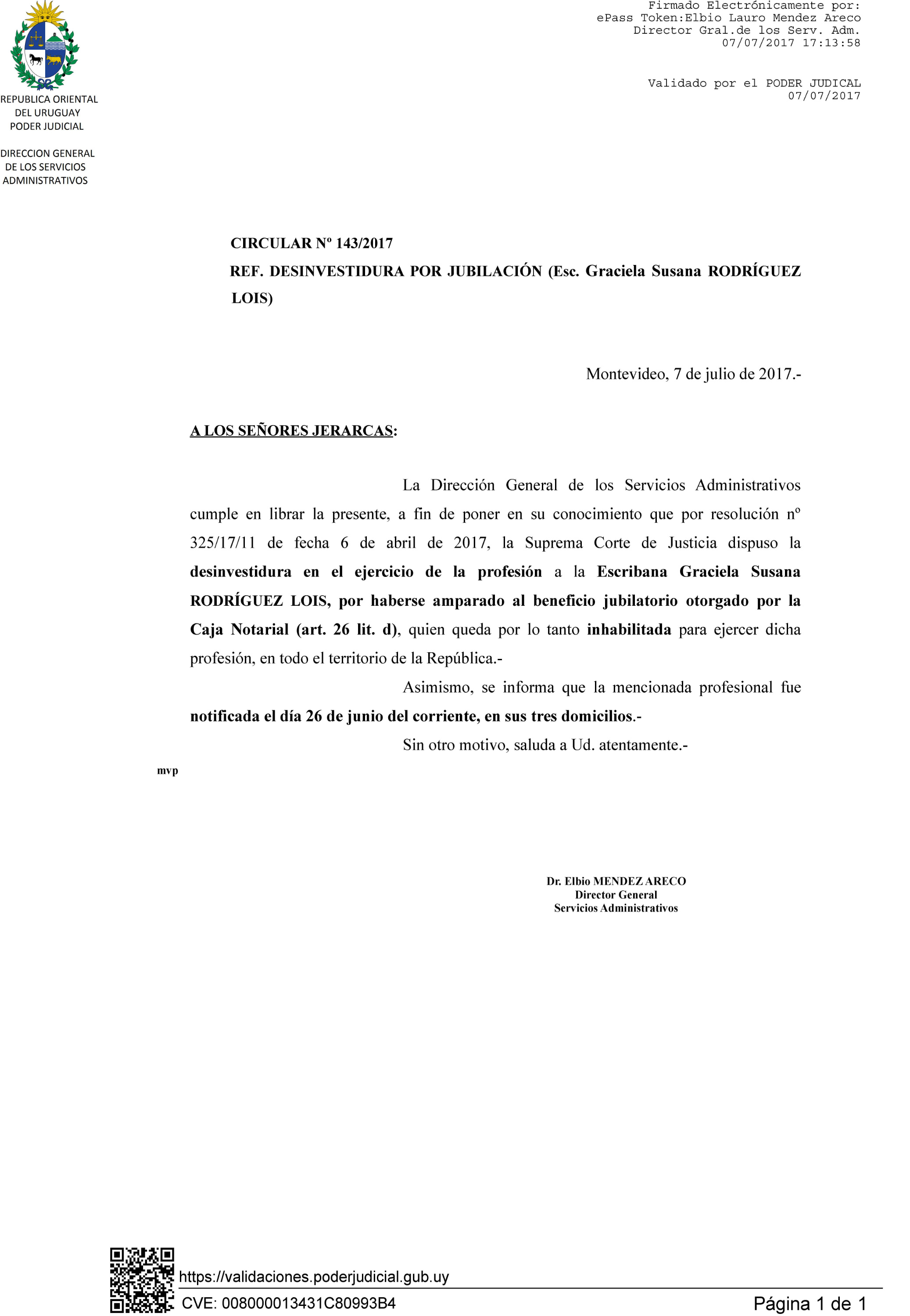 143/2017 - Desinvestidura de Escribana por jubilación