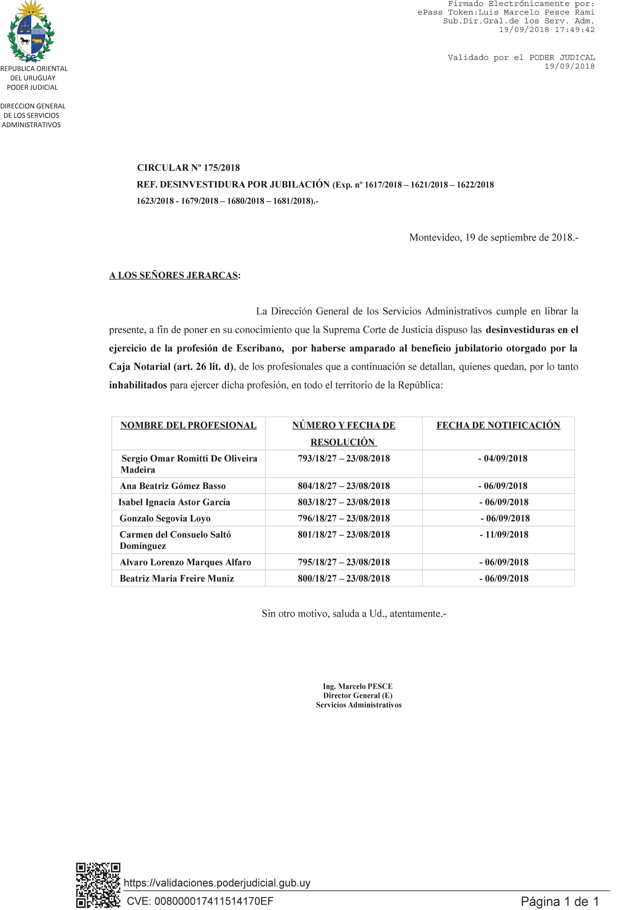 175/2018 - Desinvestidura de Escribanos por jubilación