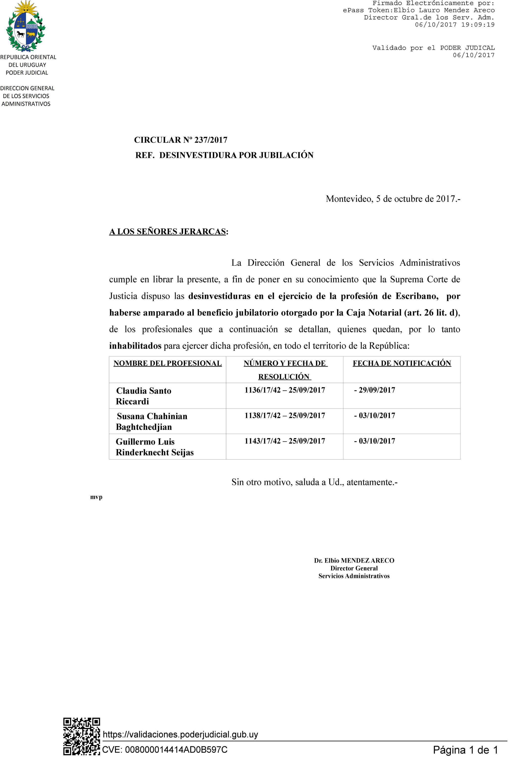 237/2017 - Desinvestidura de Escribanos por jubilación