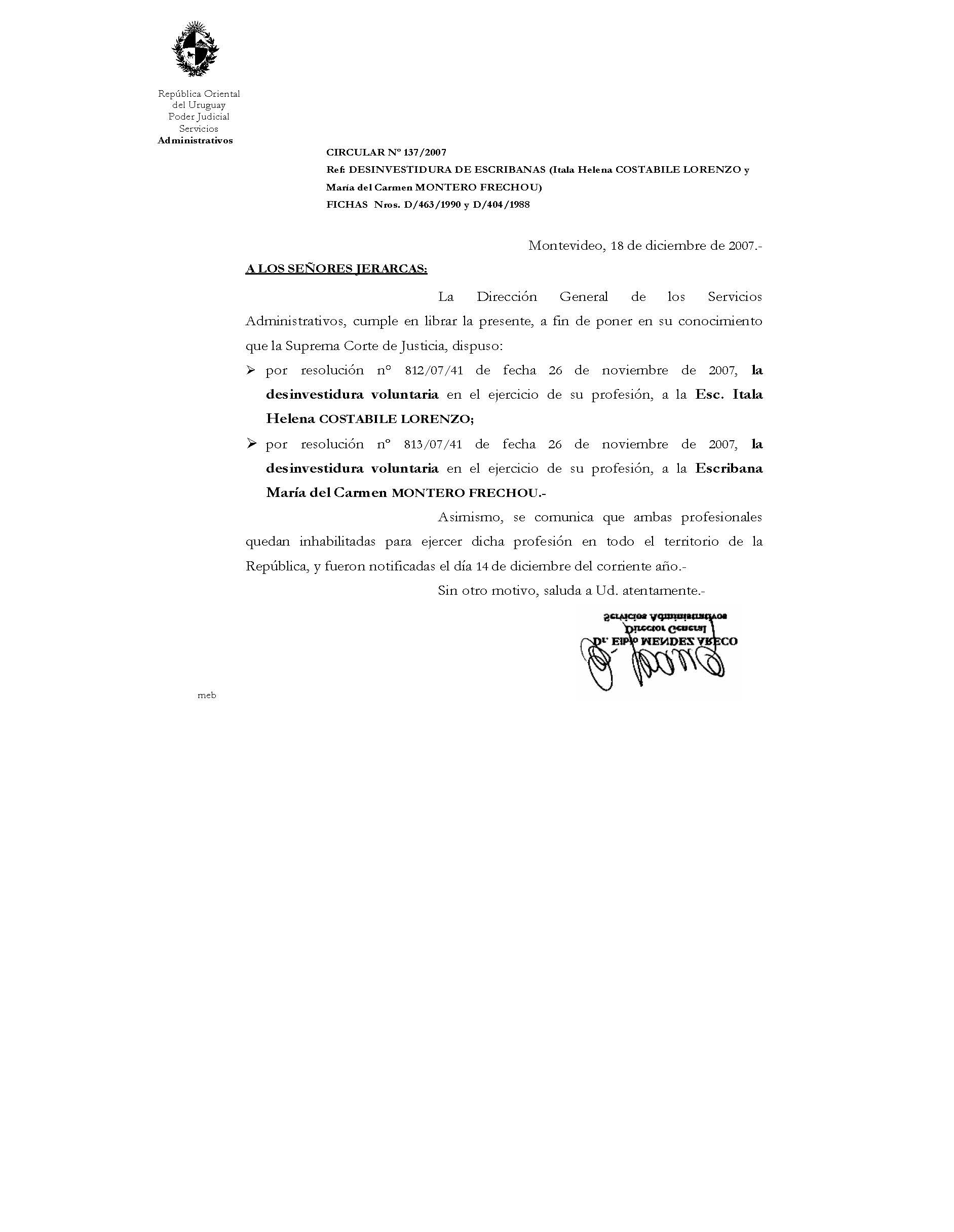 137/2007 - Desinvestidura voluntaria de Escribanas