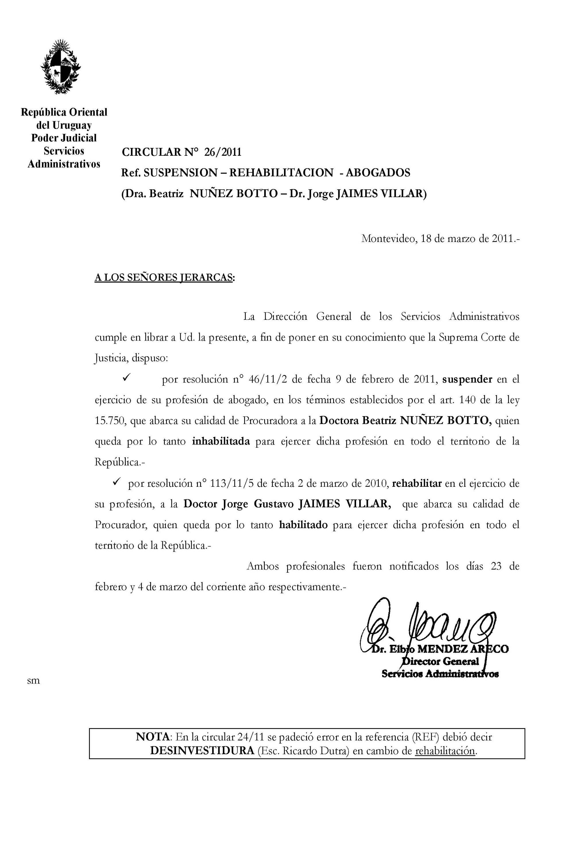 026/2011 - Suspensión y Rehabilitación de Abogados