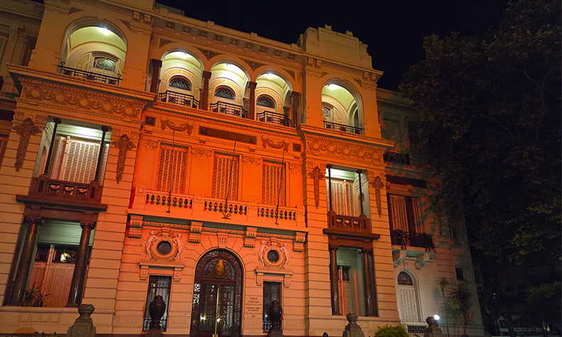 Fachada del Palacio Piria con luz naranja en el mes de la prevención del acoso laboral en el Poder Judicial
