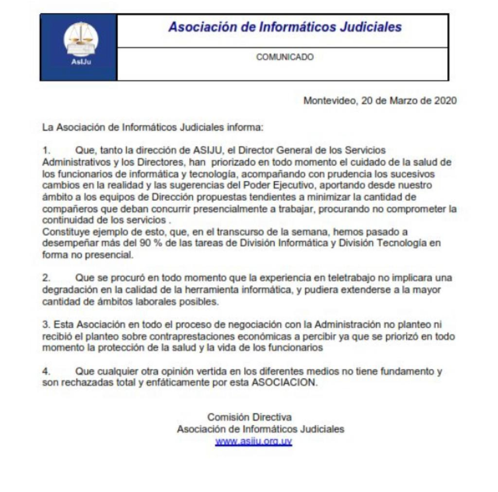La Asociación de Informáticos Judiciales (ASIJU) informó hoy que en todo el proceso de negociación con la Administración del Poder Judicial por las medidas sanitarias impuestas “no plantéo ni recibió el planteo sobre contraprestaciones económicas” y que, en cambio, se priorizó “la protección de la salud y la vida de los funcionarios”.