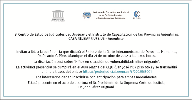 La actividad será presencial y se cumplirá en el Aula Magna del Centro de Estudios Judiciales del Uruguay (CEJU), en San José 1139 piso 6to. Además, la conferencia se transmitirá en línea por la plataforma Zoom a través de la ID 2908563001