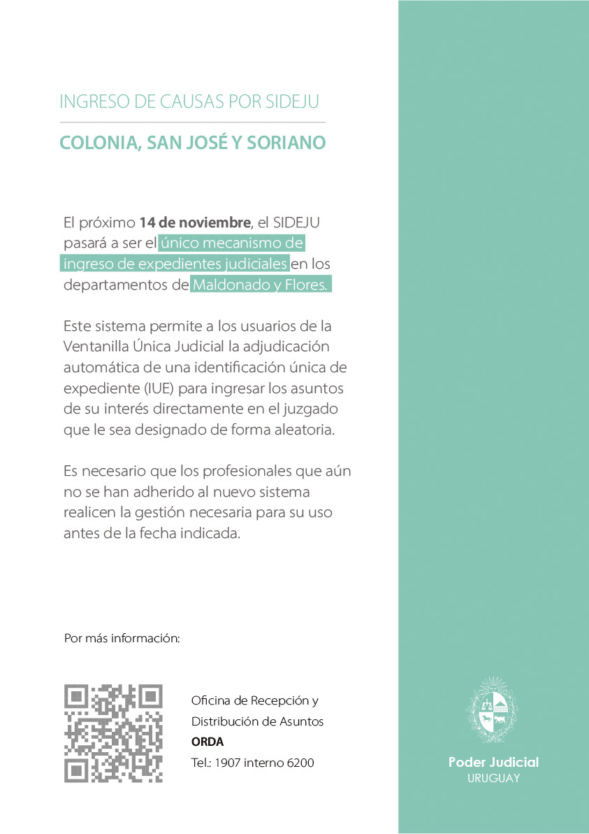 La Suprema Corte de Justicia resolvió extender el Sistema de Ingreso de Expedientes Judiciales (SIDEJU) a las oficinas de los departamentos de Colonia, San José y Soriano a partir del próximo lunes 14 de noviembre. A partir de ese momento, esta ventajosa modalidad será la única vía para el ingreso de causas en los juzgados de las referidas comunidades geográficas. Así fue establecido por Circular nº 91/2022 (Resoluc. SCJ nº 999/2022) ampliando el alcance del sistema, que ha estado operando con absoluta normalidad desde su implantación inicial en la capital del país sin que se hayan registrado fallos o impedimentos de clase alguna.