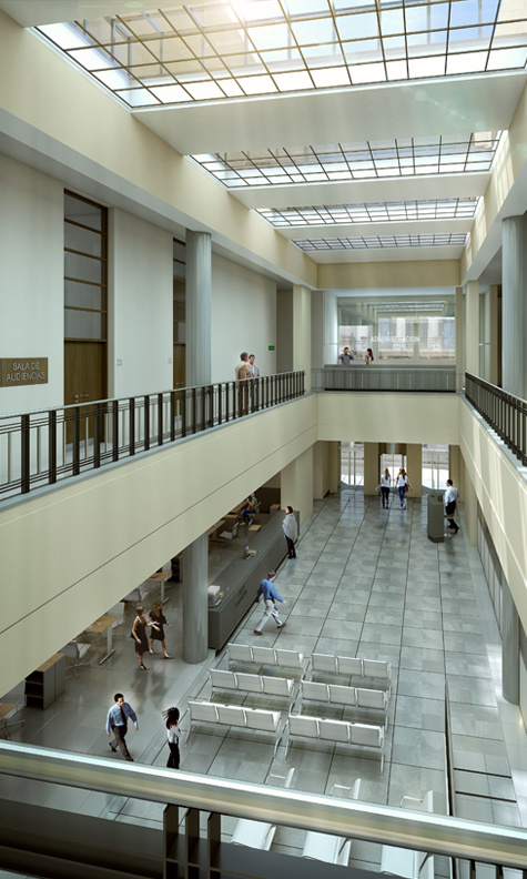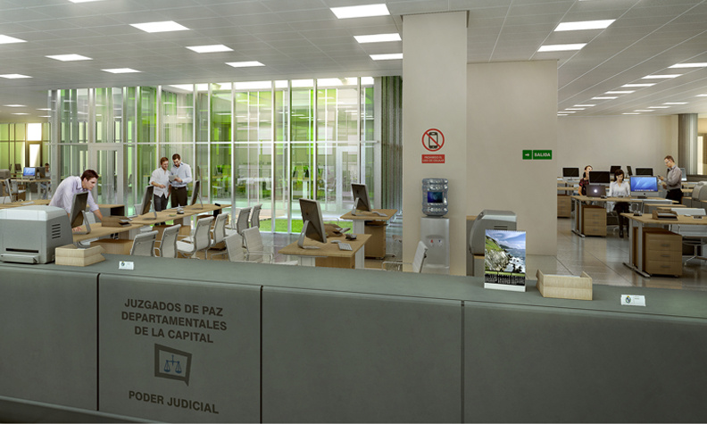 A nivel programático se propone en Planta Baja una “open office”, basada en el concepto de oficina única y centralizada, mientras que en el primer y segundo piso se ubicarán las Salas de Audiencias y los Despachos de los Magistrados respectivamente.