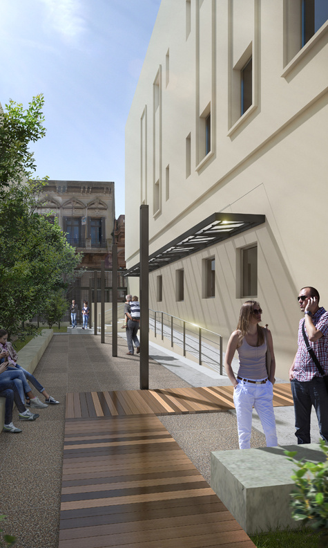 El padrón adyacente al inmueble con entrada desde la calle 25 de Mayo, se acondicionará como espacio semi-público, generando un acceso universal para personas con discapacidad física y permitiendo la apertura del muro lateral, propiciando la colocación de aberturas en los pisos altos, lo que contribuirá a la mejora de la iluminación de los locales allí ubicados. En esta misma dirección apunta la realización del patio interior a ubicarse en la zona central de la oficina centralizada de Planta Baja.