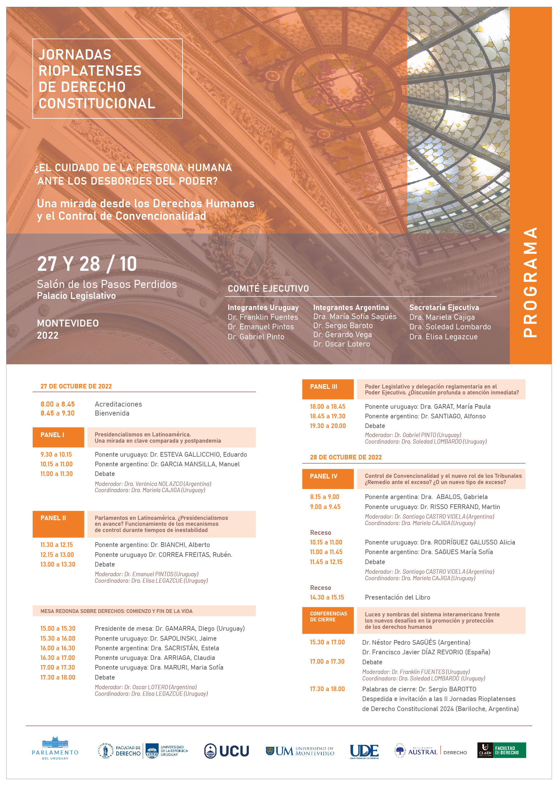 Las Primeras Jornadas de Derecho Constitucional Rioplatense denominadas "El cuidado de la persona humana ante los desbordes del poder: una mirada desde los derechos humanos y el control de convencionalidad" tendrán lugar los días jueves 27 (de 8 a 20 horas) y viernes 28 de octubre (de 8 a 18 horas) en el Salón de los Pasos Perdidos del Palacio Legislativo.